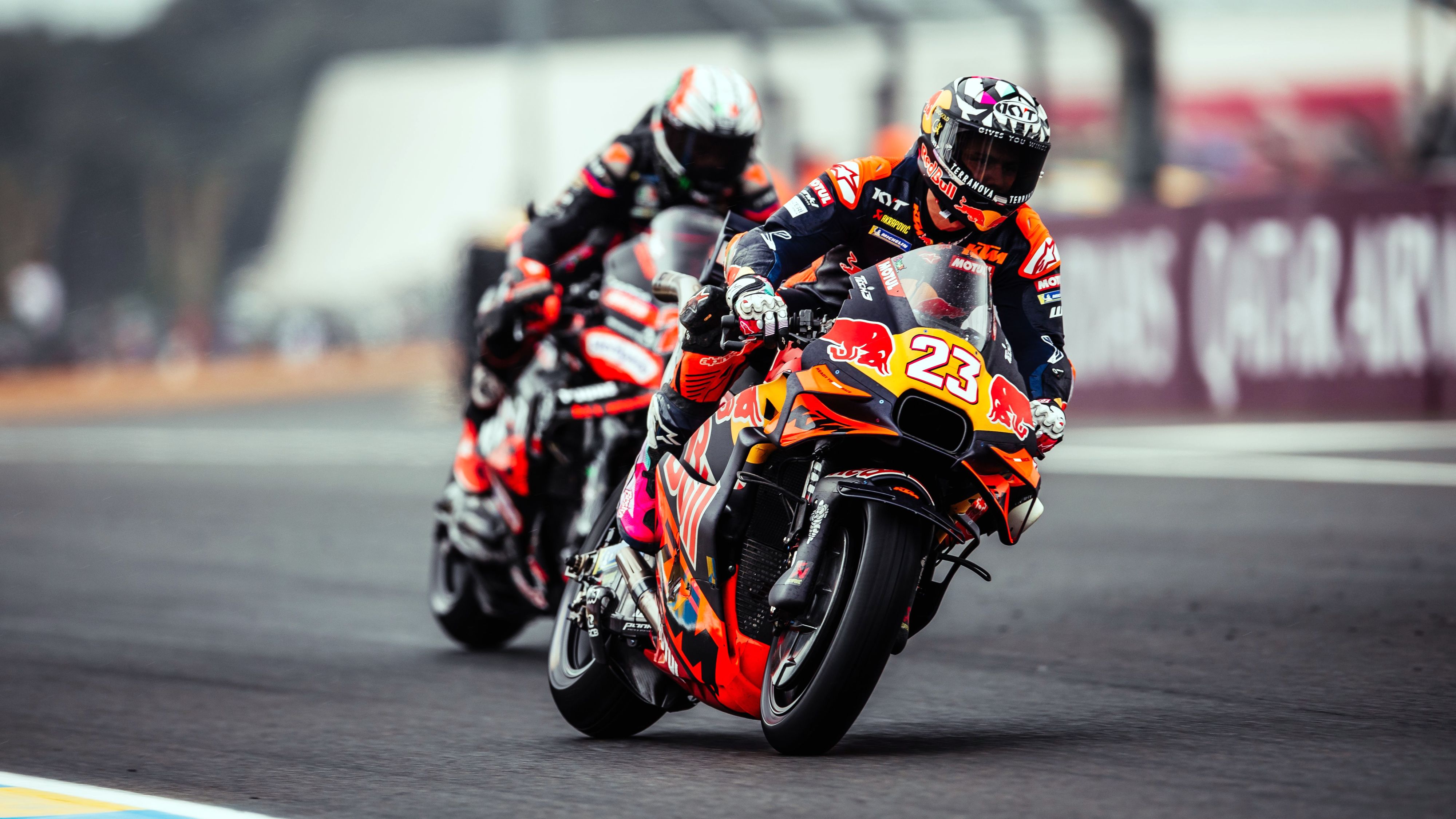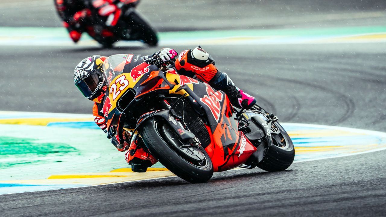 NICOLAS GOYON, Team Manager: "Hectic race that we have just lived in Le Mans. When we checked the weather conditions this morning, we knew that it could be either wet or dry, so we were ready for all possible scenarios. After two bike changes and a double long lap penalty, Maverick Viñales managed to bring us home an astonishing 5th place after an incredible performance. He has been fast in both dry and wet this weekend, which really highlights the progress he’s made with the KTM, so huge congratulations to him for his performance. Enea Bastianini got blocked in the first tricky corners at the start, and crashed once, and then another time a few laps later. Once it started to rain hard, he swapped bikes and then the pace started to get better and better. He was too far anyway, but he still managed to take 3 points with 13th. Happy that we have survived through these tricky conditions with both riders in the points, let’s now focus on the next round in Silverstone!"