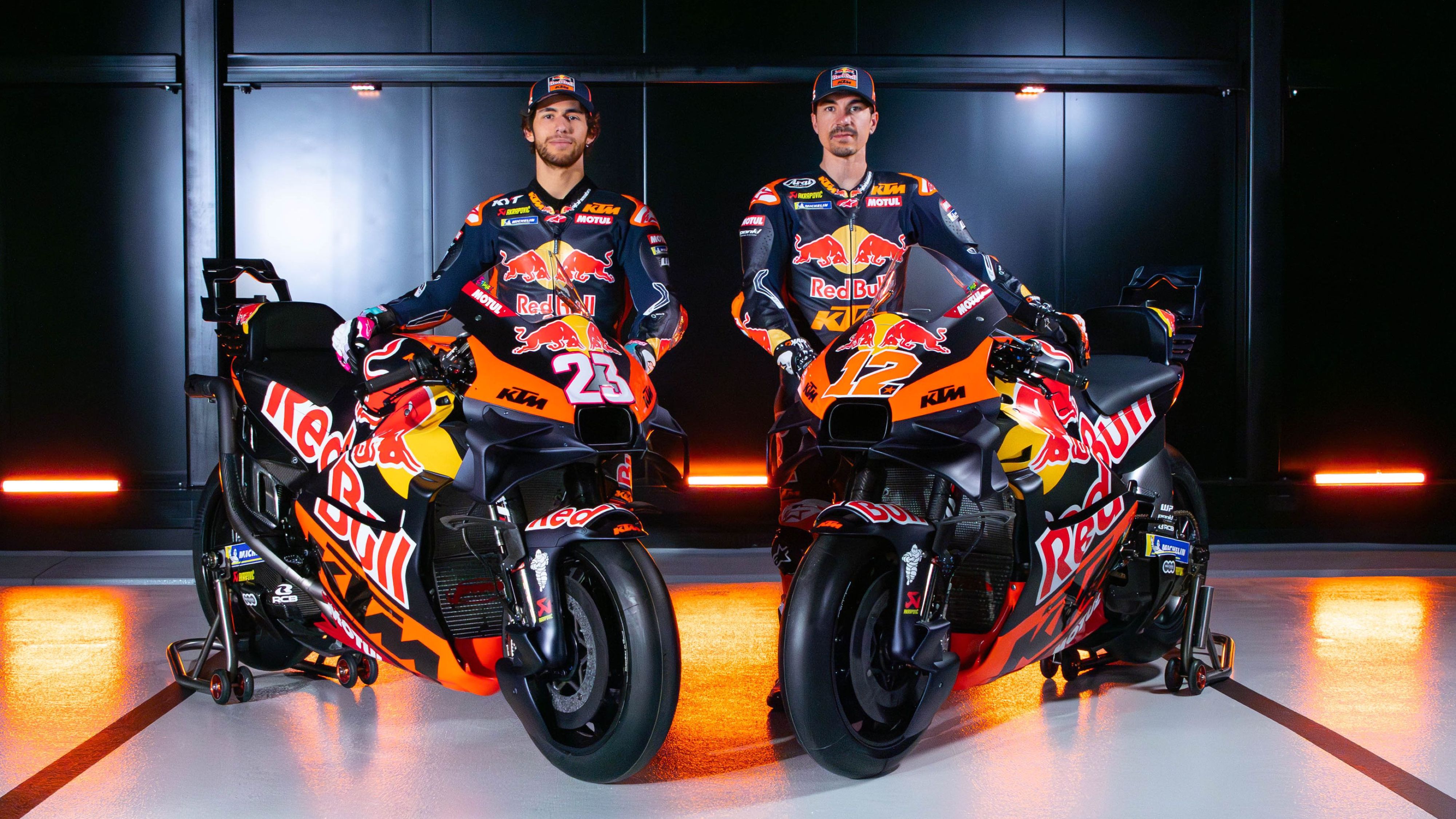 Brad Binder (29, from Potchefstroom with 17 wins, 2 in MotoGP) and Pedro Acosta (20, from Murcia with 16 wins) will team-up for Red Bull KTM Factory Racing. Enea Bastianini (27, from Rimini with 13 wins, 7 in MotoGP) and Maverick Viñales (30, from Roses with 26 wins, 10 in MotoGP) are the charges for Red Bull KTM Tech3 this year and all 22 rounds of the championship that will visit 18 countries.